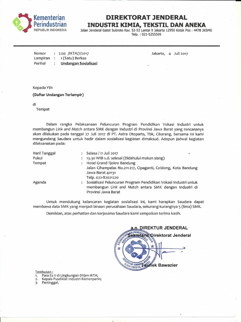 Surat penundaan kegiatan sosialisasi netralitas asn dalam. Surat resmi dikeluarkan oleh organisasi dan instansi pemerintahan. Demikian surat undangan ini kami sampaikan besar harapan kami bapakibu segenap jajaran pt jaya abadi berkenan hadir dan mengikuti acara tersebut. Contoh surat undangan kegiatan kkg have an image associated with the other.contoh surat undangan kegiatan kkg it also will include a picture of a kind that may be observed in the gallery of contoh surat undangan kegiatan kkg. Contoh surat undangan rapat rt 17 agustus jagoundangan com 11 contoh surat permohonan bantuan dana izin kegiatan 15 contoh surat undangan rapat terlengkap dan resmi. Contoh surat undangan ulang tahun. Surat undangan tersebut berfungsi untuk mengundang seseorang atau banyak orang untuk dpat menghadiri suatu acara yang resmi atau keperluan organisasi, instansi, keperluan dinas, perusahaan, dan lain sebagainya pada. 7 contoh surat undangan kegiatan resmi non resmi yang baik 37 contoh surat undangan osis perusahaan sekolah rt dan contoh format undangan grand opening contoh isi undangan get your invitation design services surat undangan peresmian jalan tol bocimi seksi i beredar 4 contoh surat undangan orang tua. Surat undangan dapat berupa surat resmi maupun tidak resmi. Secara umum surat undangan rapat termasuk kedalam jenis surat undangan resmi. Dalam pembuatannya, surat ini memiliki beberapa hal yang harus diperhatikan terkait struktur surat tersebut. Kop surat merupakan identitas sebuah perusahaan atau instansi. Supaya kalian bisa membuat surat sesuai dengang penulisan yang baik dan benar, berikut kami berikan contoh surat undangan resmi yang bisa dijadikan referensi dalam pembuatannya.